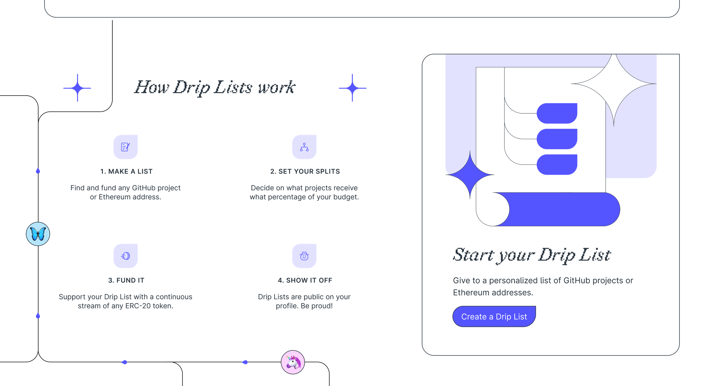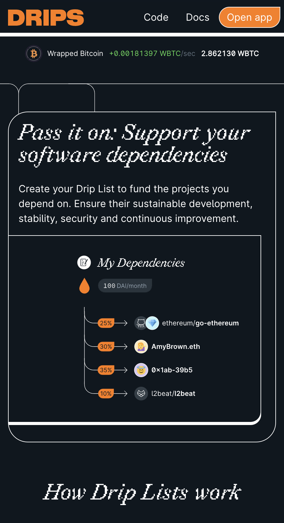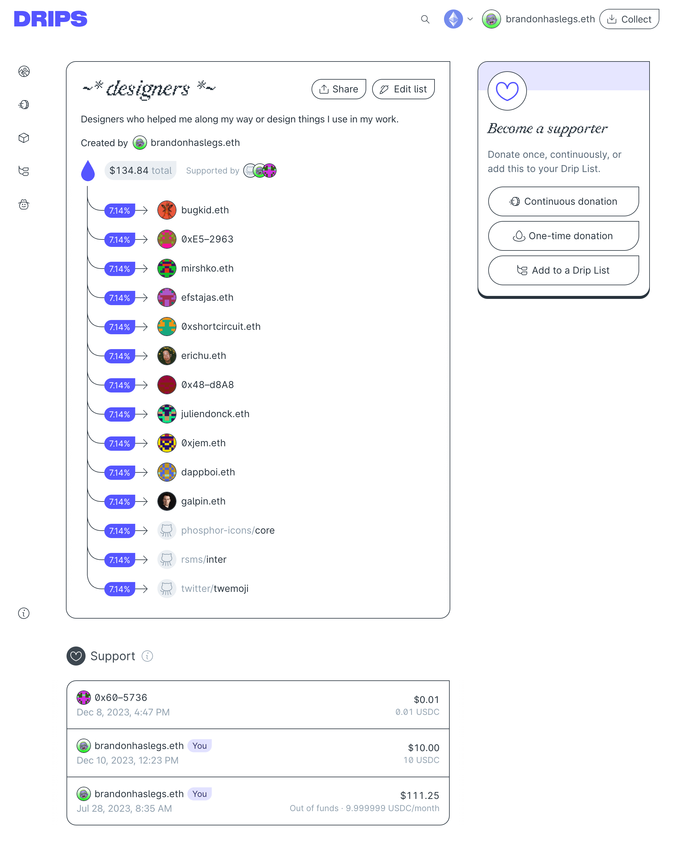 Based on existing lists that circulate in developer communities, Drips introduced the idea of funding lists, or Drip Lists. They’re easy collaborative ways to fund lists of projects and developers in the open source community.
