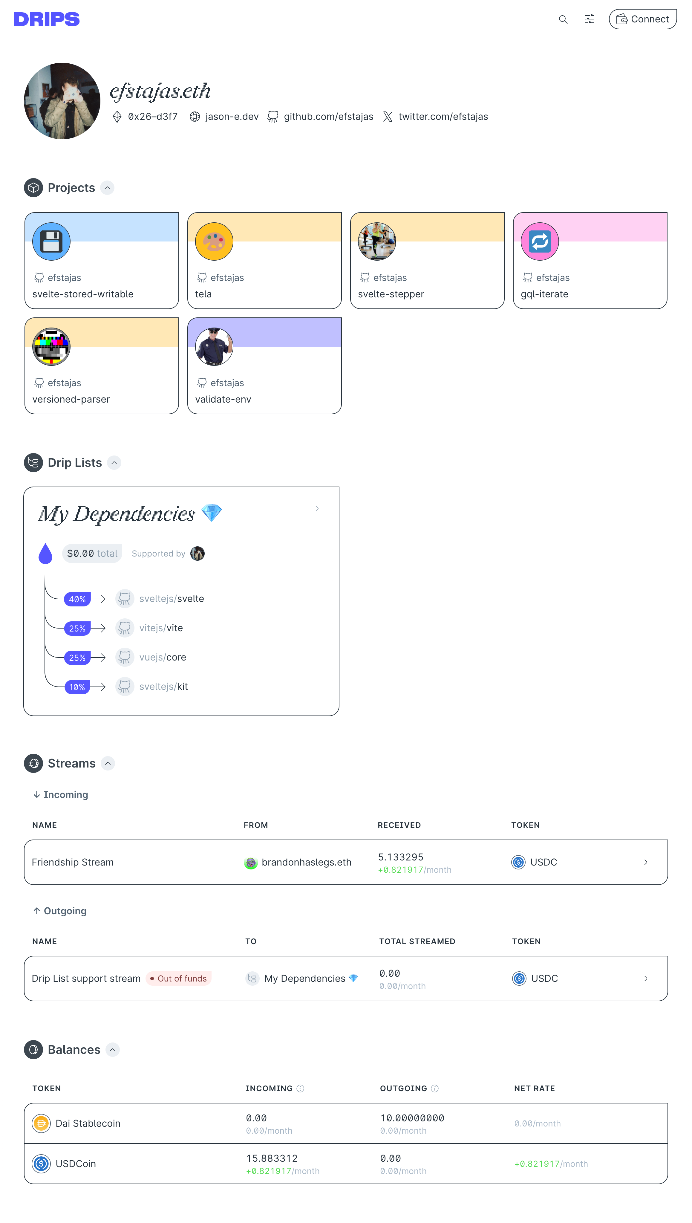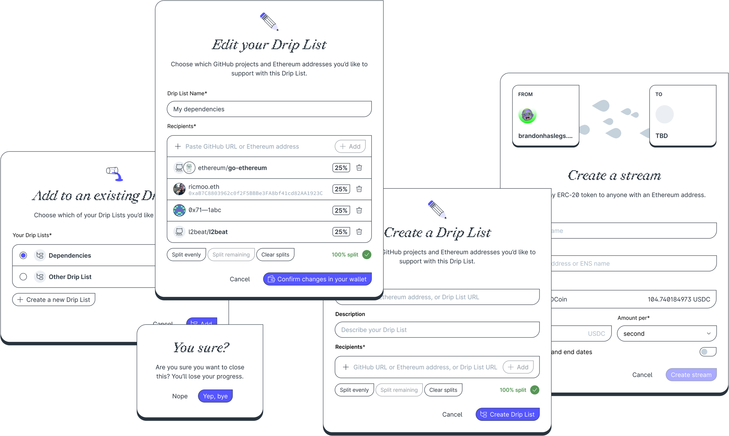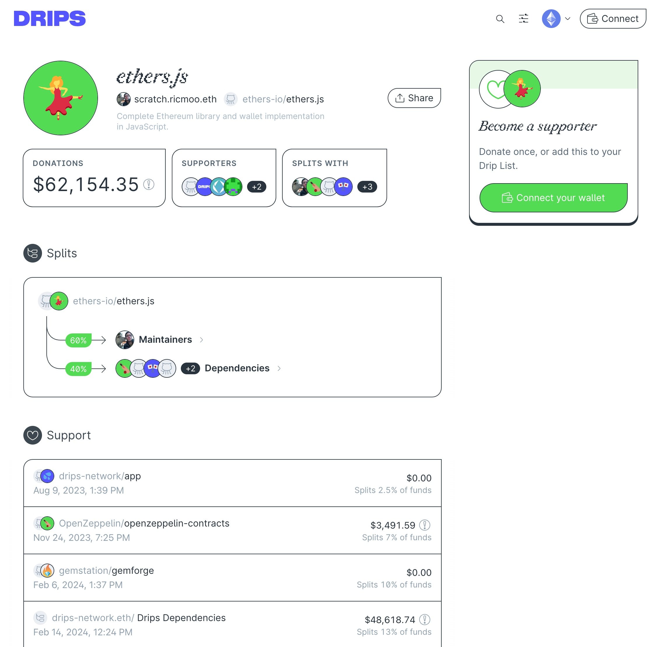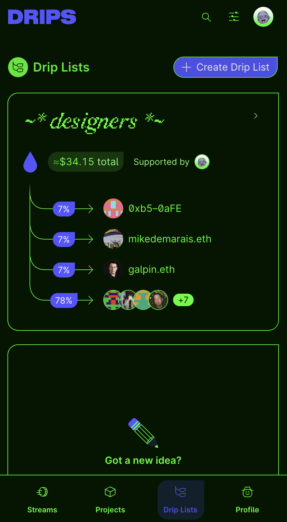 Based on existing lists that circulate in developer communities, Drips introduced the idea of funding lists, or Drip Lists. They’re easy collaborative ways to fund lists of projects and developers in the open source community.