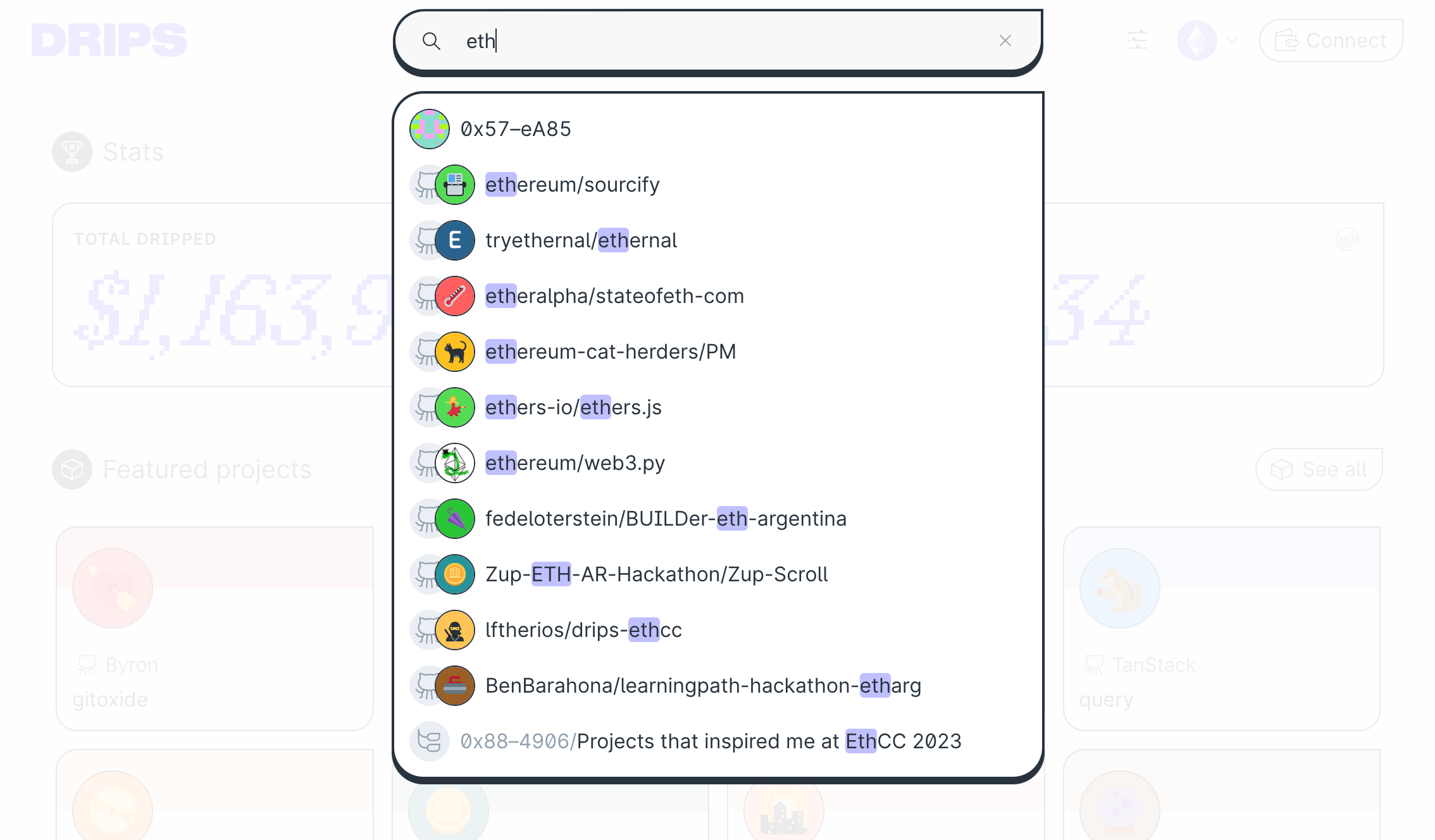 We built a comprehensive search feature that searched all claimed repos and Drip Lists. Basically anything in the Drips ecosystem is searchable.